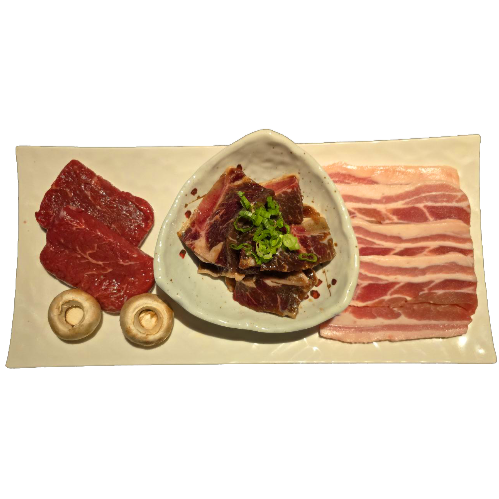 1. Beef Selection£61.90Ribeye, LA Galbi, Beef bulgogi, Fresh Lettuce, Fresh garlic & Chilli, Crispy Salad, 2 Boiled Rice